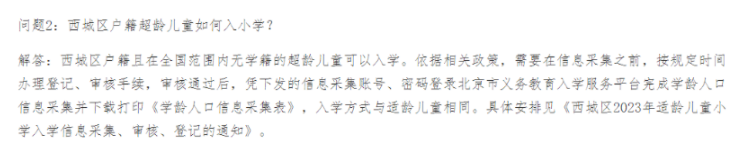 参考2023年西城区小学入学相关问题解答,京籍超龄儿童需在信息采集之前按规定时间办理登记、审核手续,审核通过后参加信息采集,详细要求请见下图: