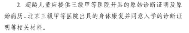 2.北京市二级以上医疗机构出具的诊断证明或与病情相关联的各种检查报告、病历和医学光片等材料的原件和复印件,或其未能按时入学的客观原因的证明证件材料。