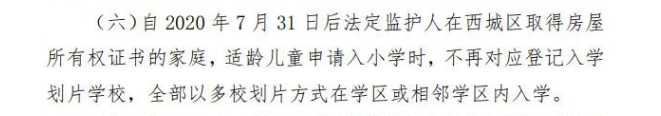 自2020年7月31日后法定监护人在西城区取得房屋所有权证书的家庭,适龄儿童申请入小学时,不再对应登记入学划片学校,全部以多校划片方式在学区或相邻学区内入学。