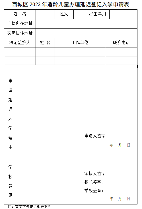 2024年适龄儿童办理延迟登记入学申请表暂未发布(参考往年会在五月初发布),家长当下可参考2023年下表: