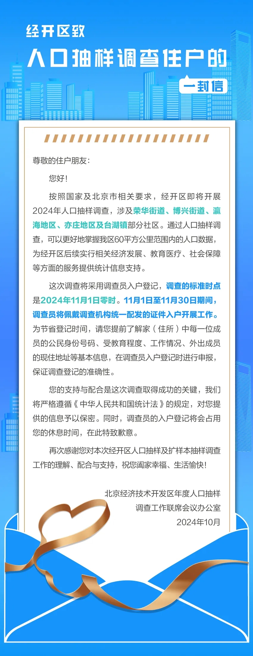 北京经济技术开发区发布了2024年年度人口抽样调查通知,经开区需要参加人口抽样调查涉及荣华街道、博兴街道、瀛海地区、亦庄地区及台湖镇部分社区,本文为您分享同步《经开区致人口抽样调查住户的一封信》。