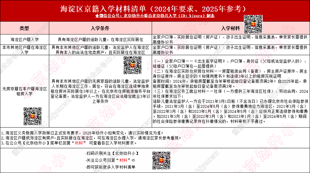 2025年海淀区幼升小家长紧急核查,入学材料准备齐全是孩子上小学敲门砖,海淀区2025年上小学需要准备哪些材料?海淀区京籍、无房京籍在非户籍海淀区租房入学、海淀区非京籍、海淀区按京籍对待入学材料不同,本文为您分享2025年海淀区各类人群入学材料清单,建议2025年及2026年海淀区幼升小家长抓紧准备。