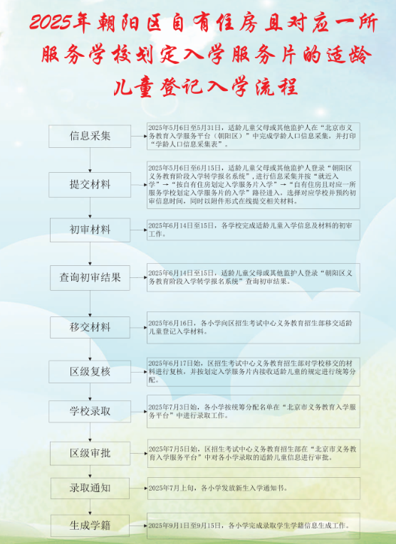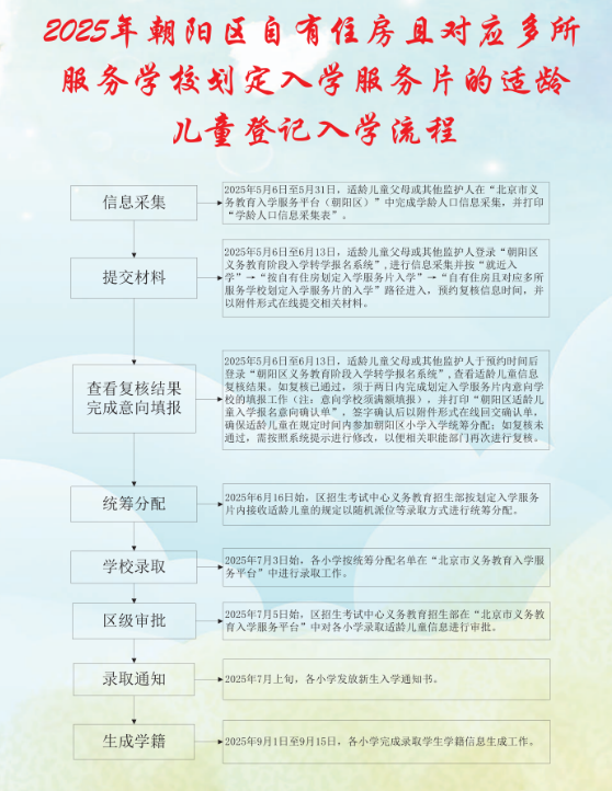 入学方式:朝阳区非京籍入学方式及流程根据房产信息有所差异,根据朝阳区义务教育阶段小学入学流程手册,对照如下: