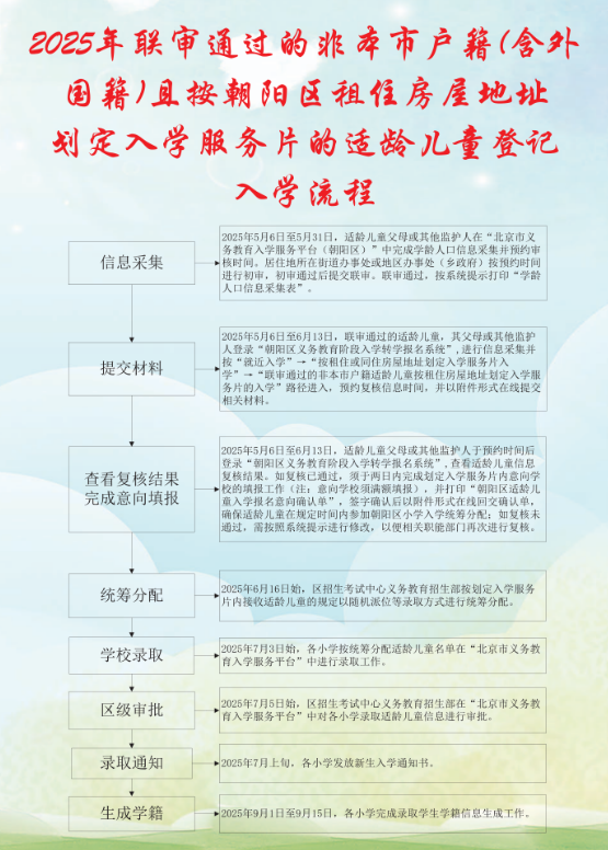 入学条件:非京籍符合→朝阳区入学材料四证要求,审核通过后入学。