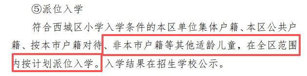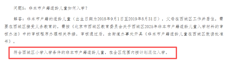 西城区2025年小学入学相关问答解答中说明西城区非京籍为全区范围内派位入学:符合西城区小学入学条件的非本市户籍适龄儿童,在全区范围内按计划派位入学,不占用登记入学学位。