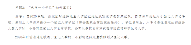自2020年起,西城区对适龄儿童入学登记地址及就读学校实施记录,自该房产地址用于登记入学之年起,原则上六年内只提供一个登记入学学位(符合国家生育政策的除外)。学位占用后,六年内居住该地址的适龄儿童入学时,不再对应登记入学划片学校,全部以多校划片方式在学区或相邻学区内入学。