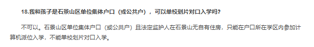 参考石景山区义务教育入学咨询问答--本市户籍(含按本市户籍对待)适龄儿童,石景山区单位集体户口(或公共户)且法定监护人在石景山无自有住房,不能单校划片对口入学,只能在户口所在学区内参加计算机派位入学。