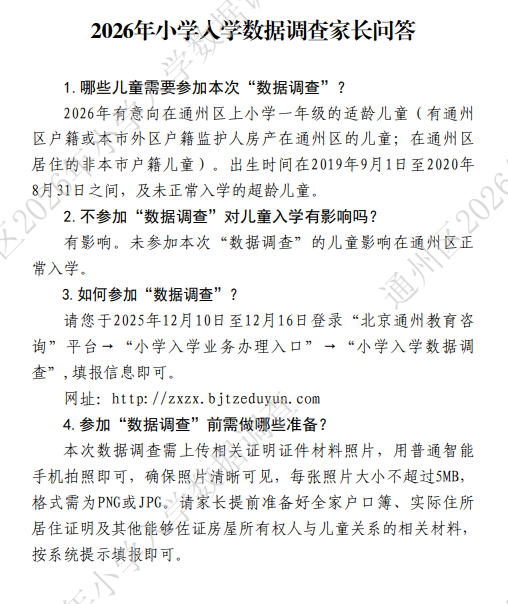 1、通州区小学入学数据调查完整内容可关注2026年通州区幼升小小学入学数据调查汇总:通知、入口、时间及注意事项;