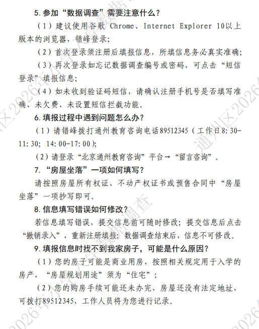 2026年通州区小学入学数据调查常见问答重磅出炉,针对家长关心的核心问题逐一回应。明确调查对象为2020年8月31日前出生的适龄儿童及超龄儿童,详解材料准备、信息修改、房屋信息填报等操作要点,同时提供咨询电话与平台留言两种求助方式,帮家长避开填报误区,高效完成登记。