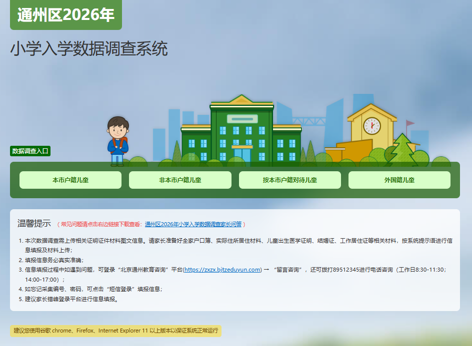 点击进入填报入口:2026年通州区小学入学儿童数据调查通知填报入口