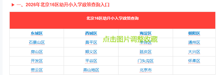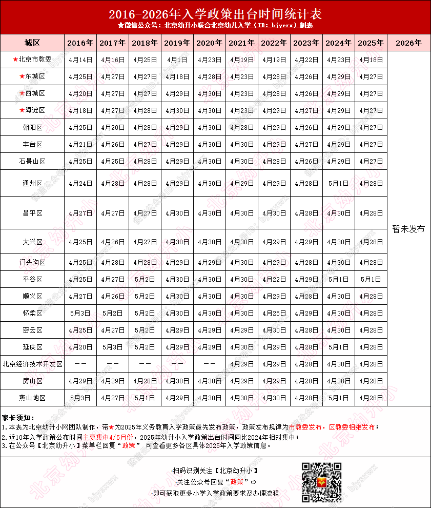 北京幼升小政策发布轨迹为北京市义务教育入学政策→16区自行发布入学政策,一般集中在4月中下旬发布,详情可收藏查看北京16区2026年幼升小小升初入学政策查询入口(义教政策/信息采集/材料审核/招生简章/小学报名)。
