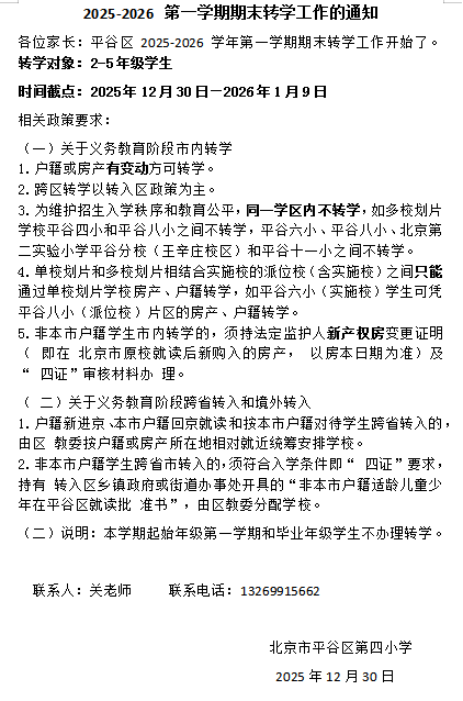 平谷区第四小学2025-2026学年第一学期期末转学工作的通知