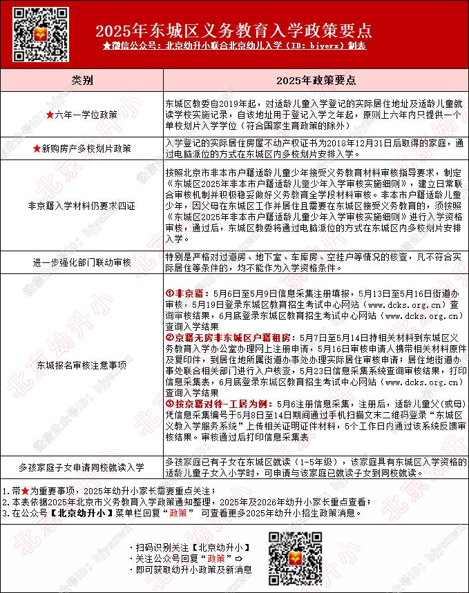 东城区实行六年一学位政策、1231新购房多校划片政策等政策,同时非京籍四证审核要求、各户籍审核报名要求需家长提前关注: