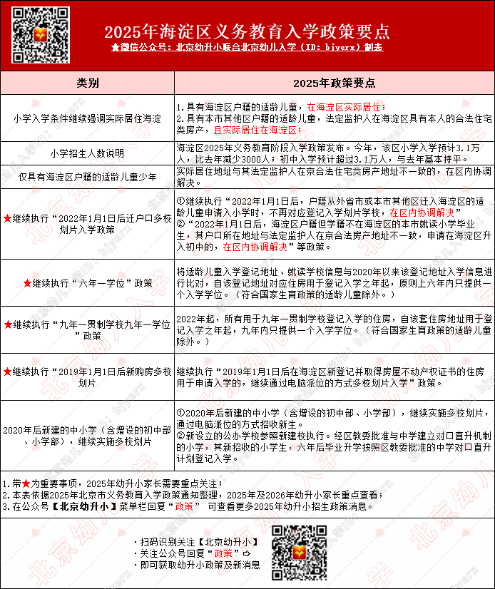 海淀区实行六年一学位政策、九年一学位政策、1911新购房及2211新迁户多校政策等政策,同时非京籍四证审核要求、各户籍审核报名要求需家长提前关注: