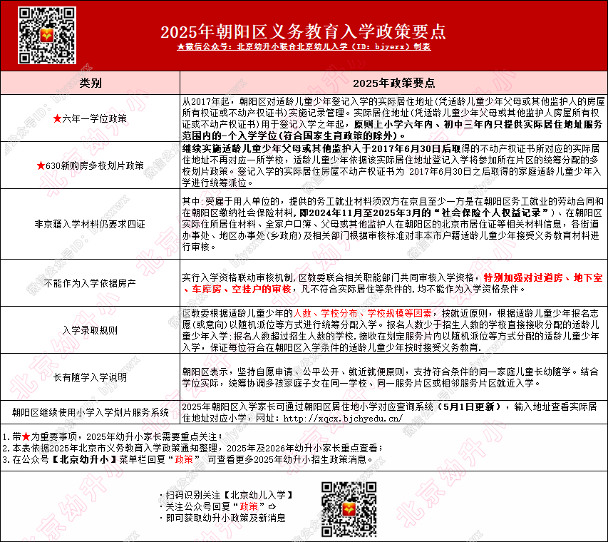 朝阳区实行六年一学位政策、630新购房多校政策等政策,同时非京籍四证审核要求、各户籍审核报名要求需家长提前关注: