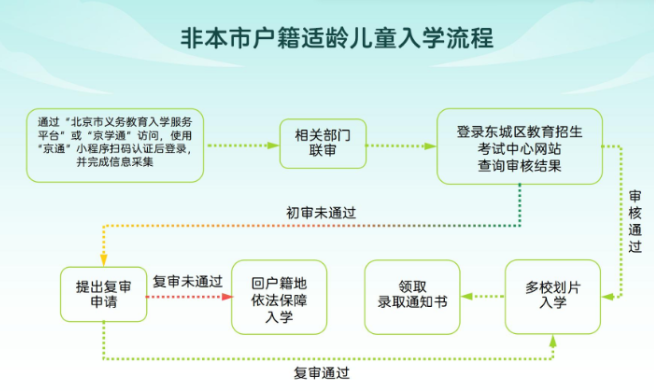 参考东城区幼升小非京籍入学流程图,信息采集审核通过的非京籍幼升小将以多校划片方式入学: