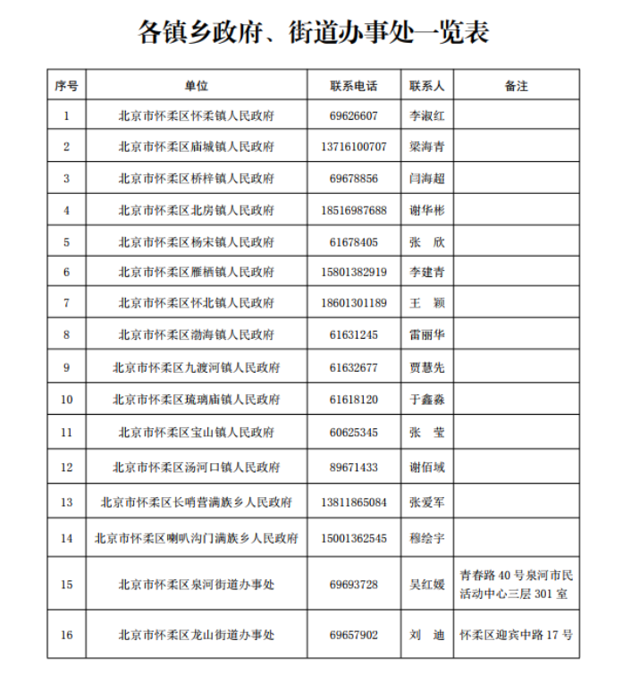 怀柔区街道办事处、乡镇人民政府联系电话