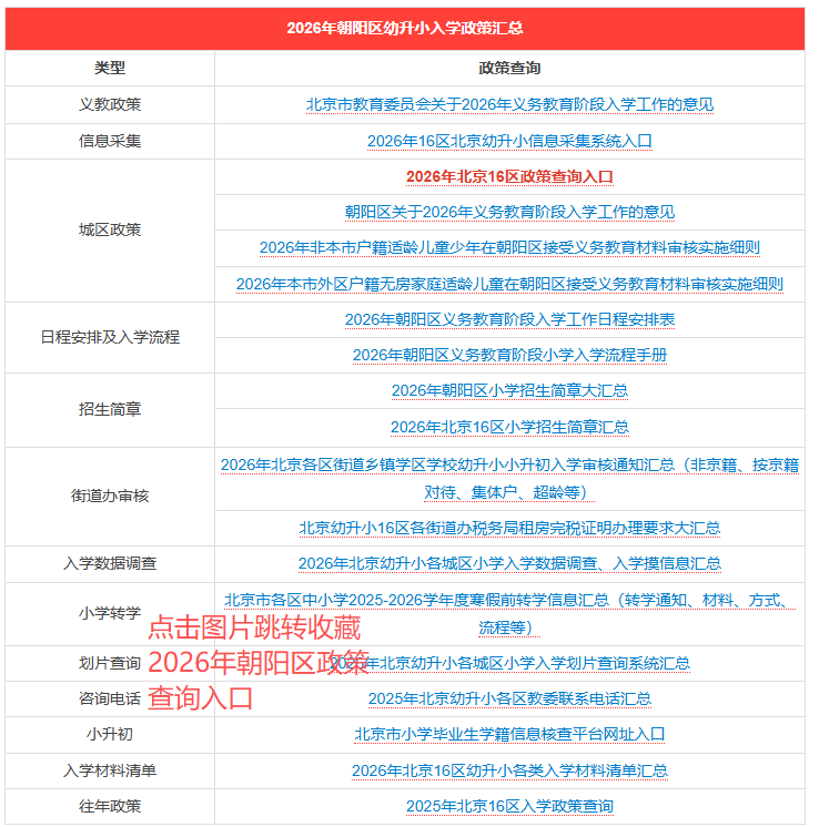 2026年朝阳区家长可收藏:2026年朝阳区幼升小入学政策大汇总:义教政策、非京籍四证审核标准、信息采集、小学招生简章...,待政策发布后可以及时获取最新政策;同时建议2027年朝阳区幼升小家长也提前查看了解。