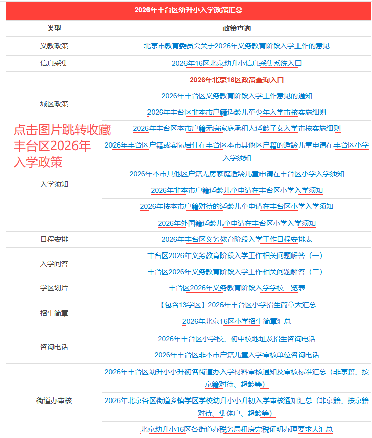 2026年丰台区家长可收藏:2026年丰台区幼升小入学政策大汇总:义教政策、非京籍四证审核标准、信息采集、小学招生简章...,待政策发布后可以及时获取最新政策;同时建议2027年丰台区幼升小家长也提前查看了解。