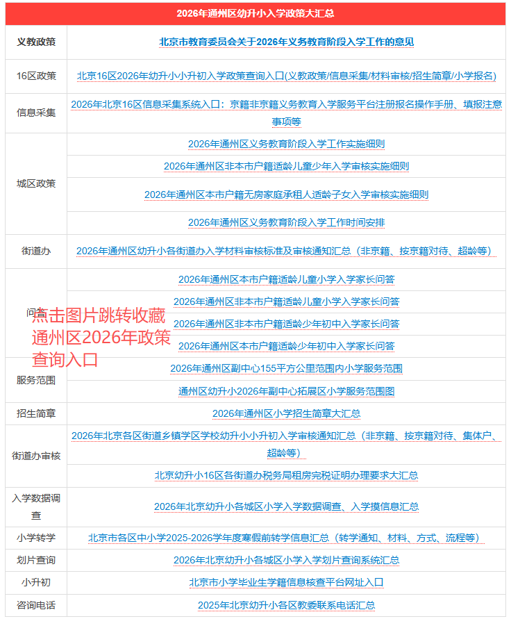 2026年通州区家长可收藏:2026年通州区幼升小入学政策大汇总:义教政策、非京籍四证审核标准、信息采集、小学招生简章,待政策发布后可以及时获取最新政策;同时建议2027年通州区幼升小家长也提前查看了解。