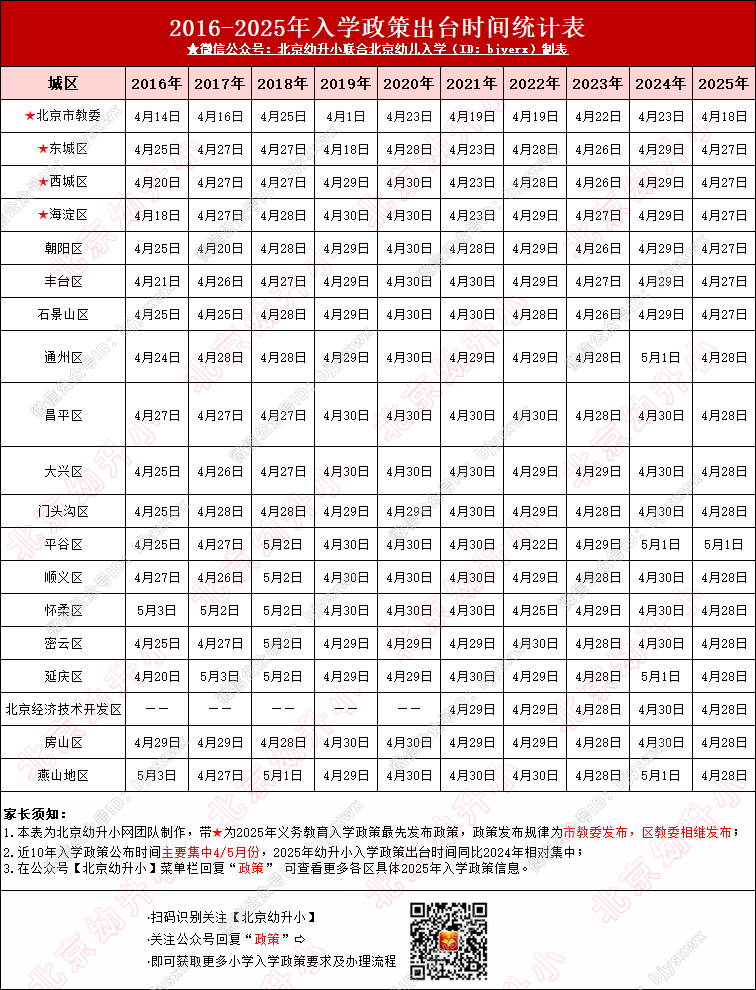从上图可看出,历年来北京各区义务教育入学政策集中4月公布!发布顺序为:北京市义务教育入学政策优先公布→各区义务教育入学政策随后出台!