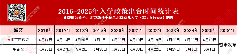 平谷区入学政策将在4月底正式发布,家长可先行参考2016年-2025年发布时间: