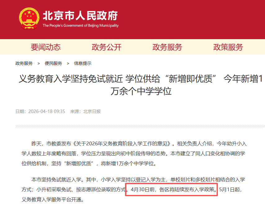 根据北京市人民政府、北京日报发布信息来看,4月30日前各区入学政策即将发布,家长务必收藏北京16区2026年幼升小小升初入学政策查询入口(义教政策/信息采集/材料审核/招生简章/小学报名):
