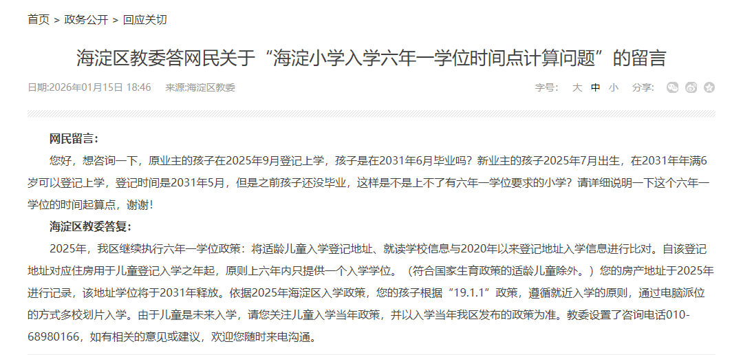 温馨提醒:北京各区六年一学位政策详情、学位占用情况可点击查看2026年北京幼升小各城区六年一学位政策、九年一学位政策大汇总(含学位占用说明及查询情况)