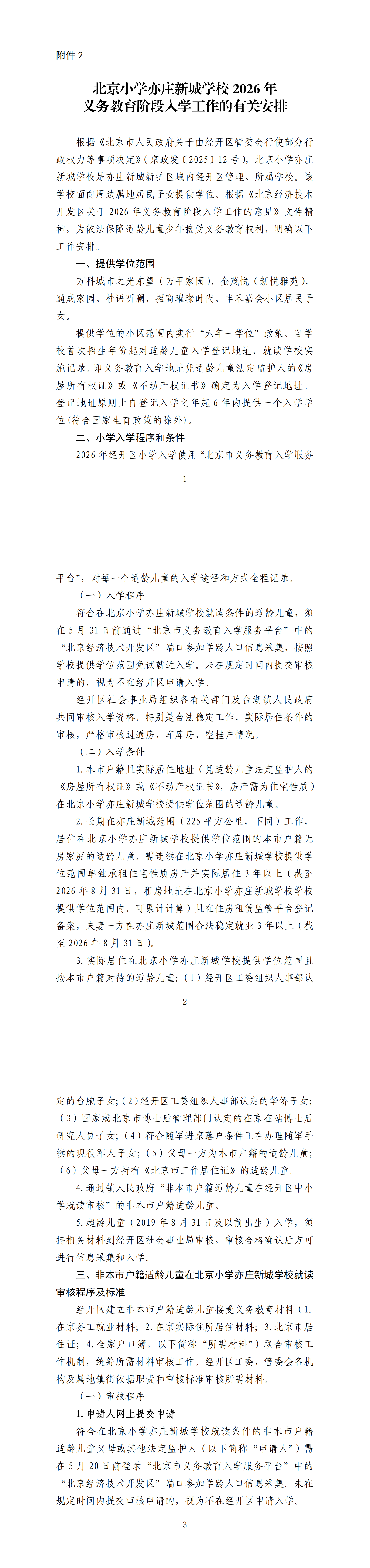 北京小学亦庄新城学校2026年义务教育阶段入学工作的有关安排
