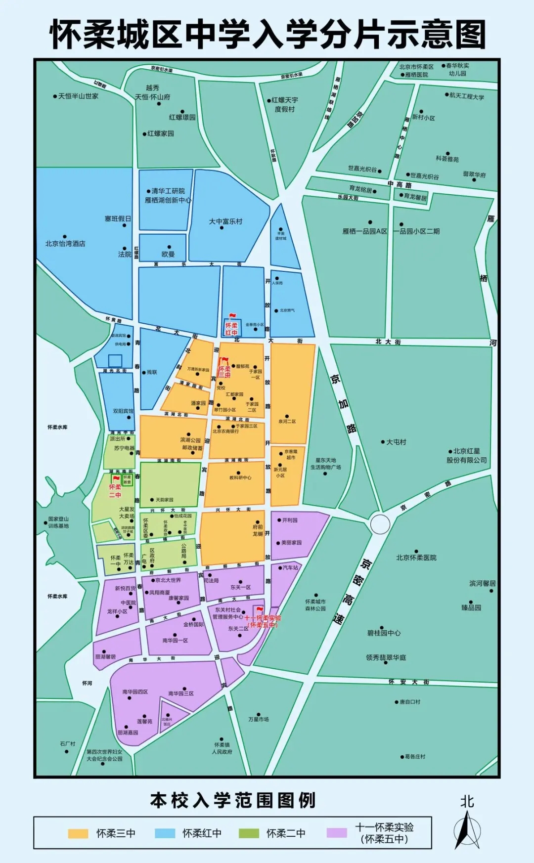 4.首师大附属红螺寺中学:滨湖北街以北、北大街以南、北斜街以西至青春路;湖光中街以北、怀黄路以南、青春路以西至城区边界;怀黄路及北大街向北至城区边界、京加路以西至城区边界;大中富乐、刘各长行政村;具有怀柔镇户籍的郭家坞小学毕业生。