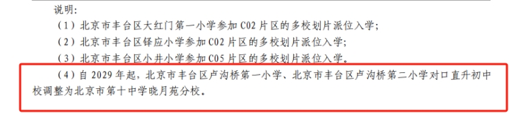 丰台区2023年义务教育阶段入学片区中说明,自2029年起,北京市丰台区卢沟桥第一小学、北京市丰台区卢沟桥第二小学对口直升初中校调整为北京市第十中学晓月苑分校: