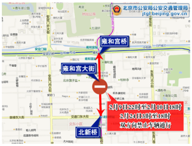 元宵节当天3:00至18:00,雍和宫大街由雍和宫桥下路口(不含)至北新桥路口(不含)双方向禁止车辆通行。车辆可绕行安定门内大街和东直门北小街。