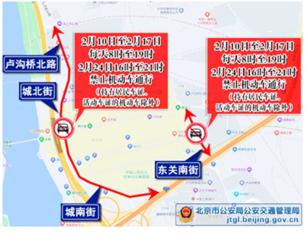 当日16:00至21:00,城南街、城北街、卢沟桥北路(城北街至五环路入口匝道段)、东关南街禁止机动车通行(持有居民车证、活动车证的机动车除外)。