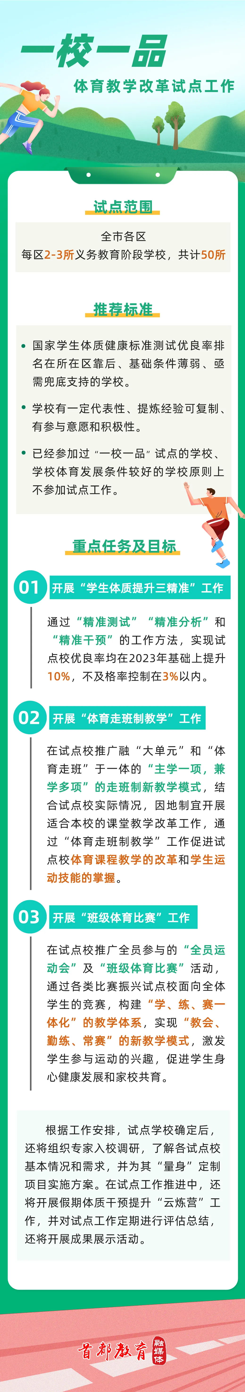 3月21日,北京市教委网站发布通知,提出开展2024年北京市中小学“一校一品”体育教学改革试点,遴选50所义务教育阶段学校参与。试点校将开展“学生体质提升三精准”“体育走班制教学”和“班级体育比赛”工作。