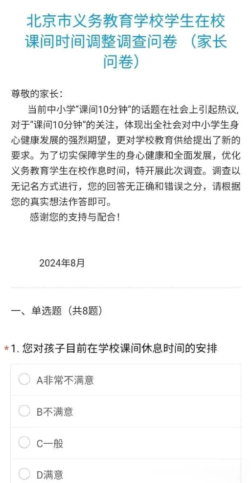 网传!北京中小学课间或将调整为15分钟!近期有部分家长收到《北京市义务教育学校学生在校课间时间调整》调查问卷,单选题共8题,主要为调查目前家长对孩子课间休息时间的满意度~
