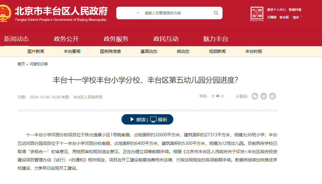 十一丰台小学河西分校项目位于珠光逸景小区1号院南侧,占地面积约32600平方米,建筑面积约27313平方米,规模为36班小学;丰台五幼河西分园项目位于十一丰台小学河西分校南侧,占地面积约6400平方米,建筑面积约5300平方米,规模为12班幼儿园。目前两所学校已取得“多规合一”初审意见、用地预审和规划选址意见,正在办理立项等前期手续。根据《北京市丰台区人民政府关于印发<丰台区政府投资建设项目管理办法(试行)>的通知》相关规定,项目在开工建设前需完善相关法律、行政法规规定的各项前期手续。教委将继续加快推进学校建设,力争早日实现开工建设。