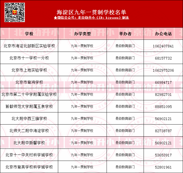 海淀区九年一贯制学校名单