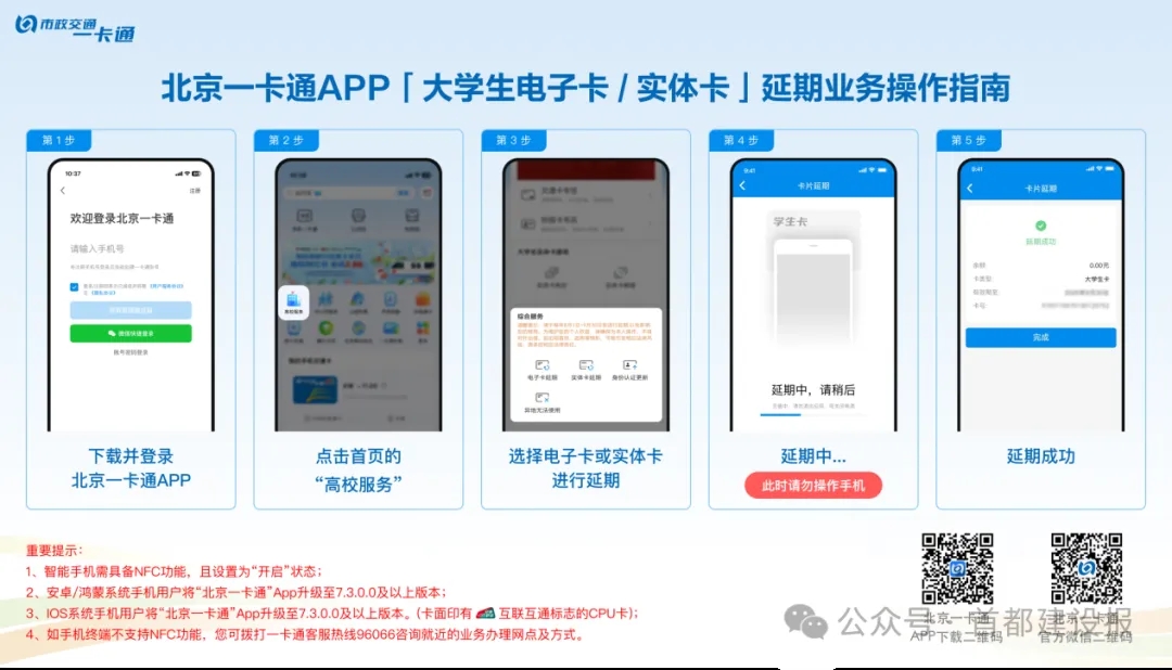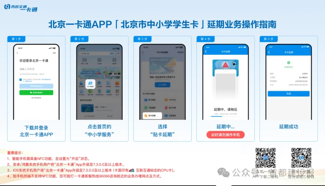 为满足学生便捷乘坐公共交通出行的需求,一卡通公司按照北京市教委要求试点发行中小学NFC电子卡,持有中小学NFC电子卡产品的学生无需办理延期,即可正常使用;若为小升初、初升高阶段的学生,需通过“北京一卡通”APP进行“卡片升学”操作,更新学籍信息后即可继续使用。