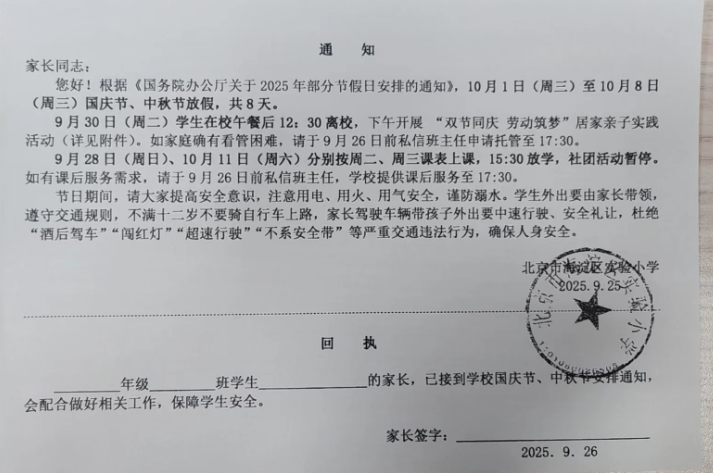 2025年北京市幼儿园、中小学、高校国庆节中秋节放假通知持续更新!国庆佳节脚步渐近,海淀区实验小学正式发布2025年国庆节放假通知,明确学生将在周二午餐后有序离校,提醒家长做好接送准备,同时节后10月11日上周三的课表。海淀区实验小学倡导孩子们在假期中放松身心、增长见识,以饱满的精神状态回归校园。让我们共同期待这个充满欢乐与意义的国庆假期!