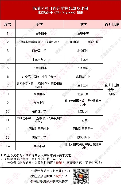 西城区继续实施小学对口直升初中政策,对口直升比例从2015年的30%逐年提高到2020年的80%,目前西城区对口直升比例已达80%,简单而言,就是在以下小学上学,有八成比例可直升至三帆中学、北京四中、北京八中等在内的学校👇
