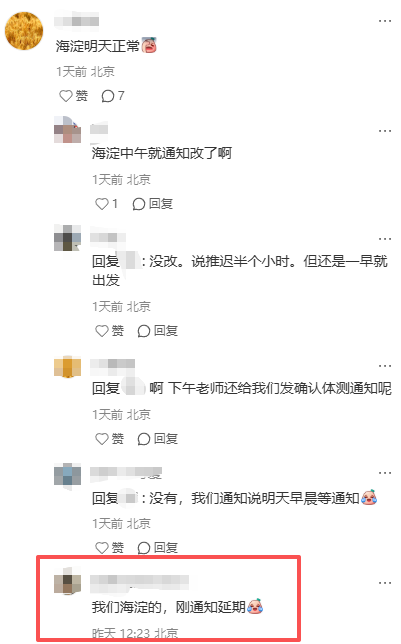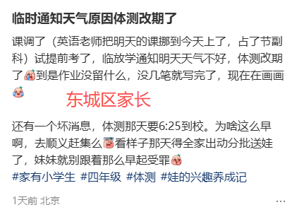 根据东城区家长分享,临放学通知天气不好,体测改期了: