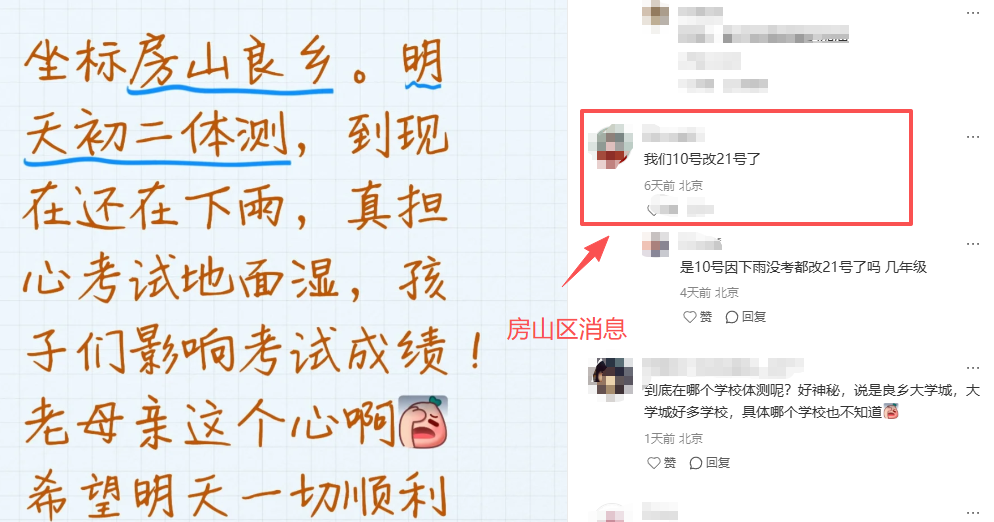 部分房山区家长分享体测时间延期至下周二(10月21日):