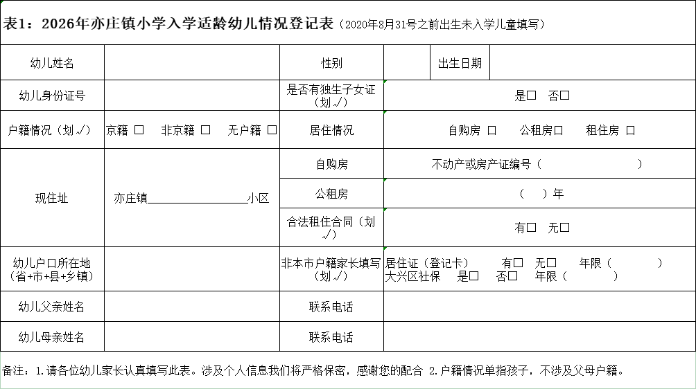 2026年亦庄镇小学入学适龄幼儿情况登记表