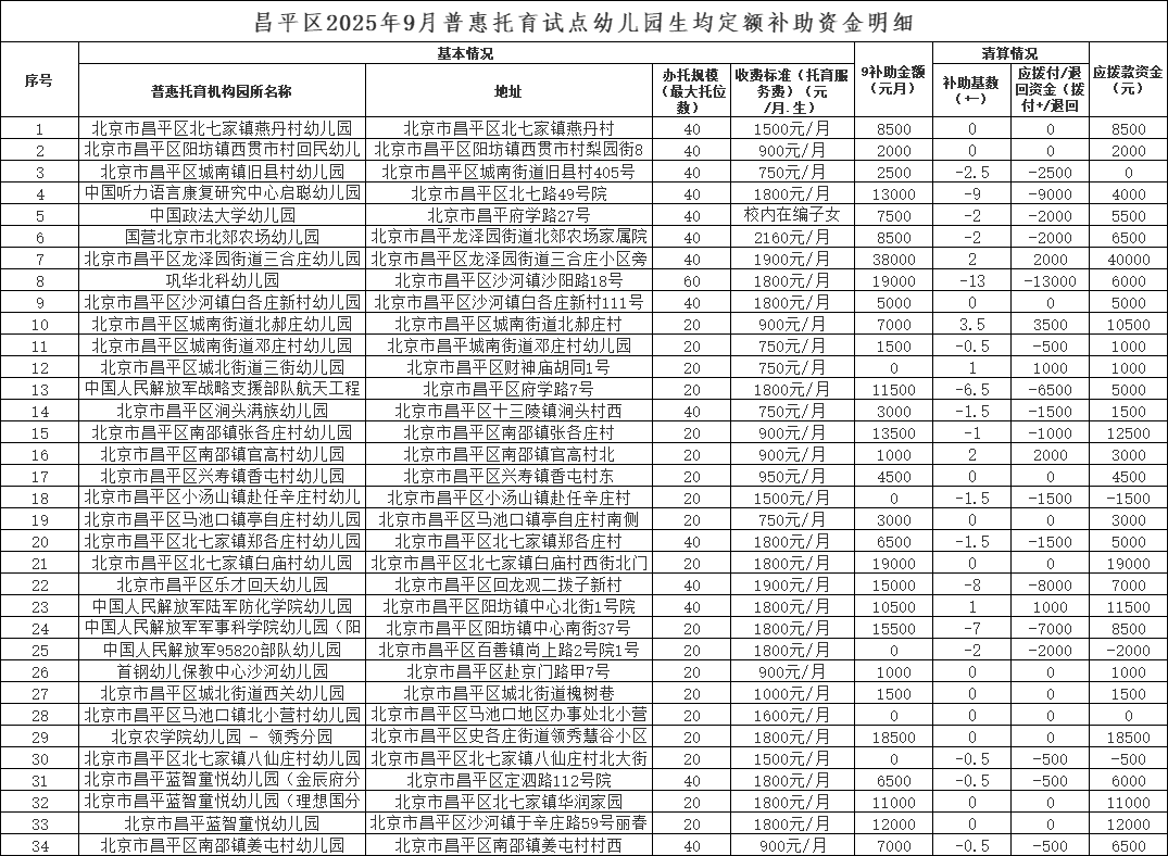 2025年9月关于昌平区拟享受普惠托育幼儿园生均定额补助资金名单公示