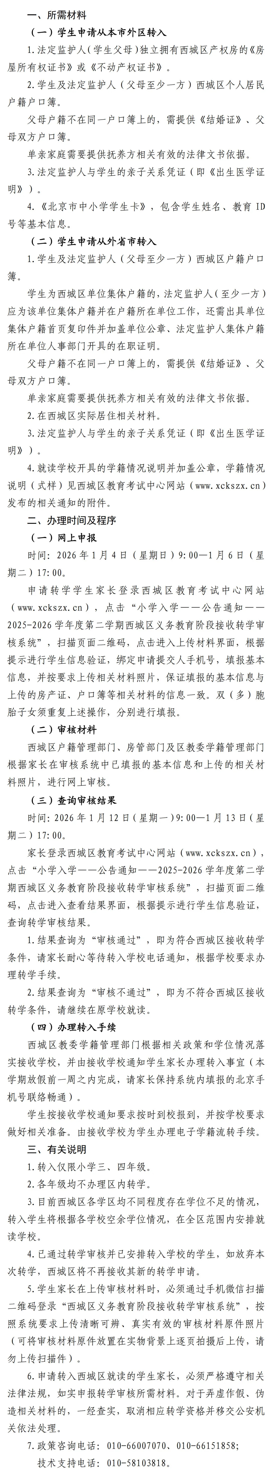 2025-2026学年度第二学期西城区义务教育阶段公办学校接收转学申请工作安排