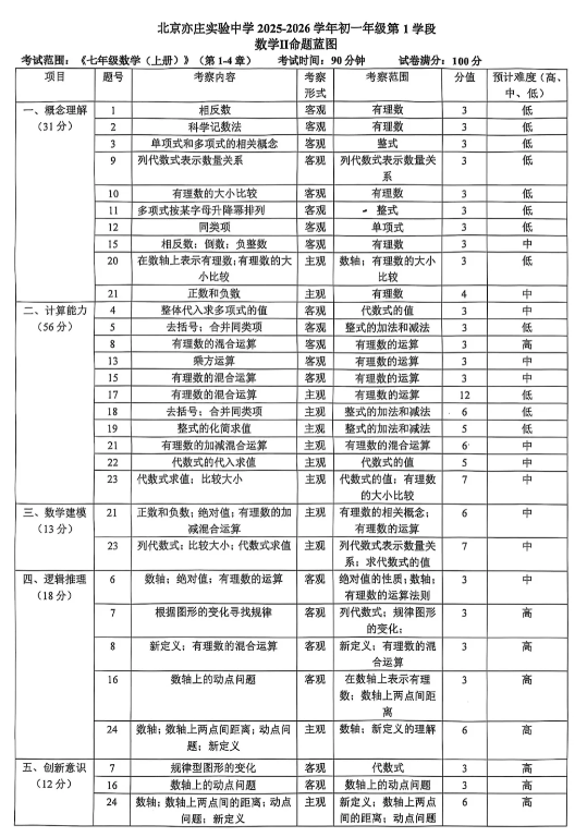 北京亦庄实验中学发布2025-2026学年初一年级第1学段数学命题蓝图