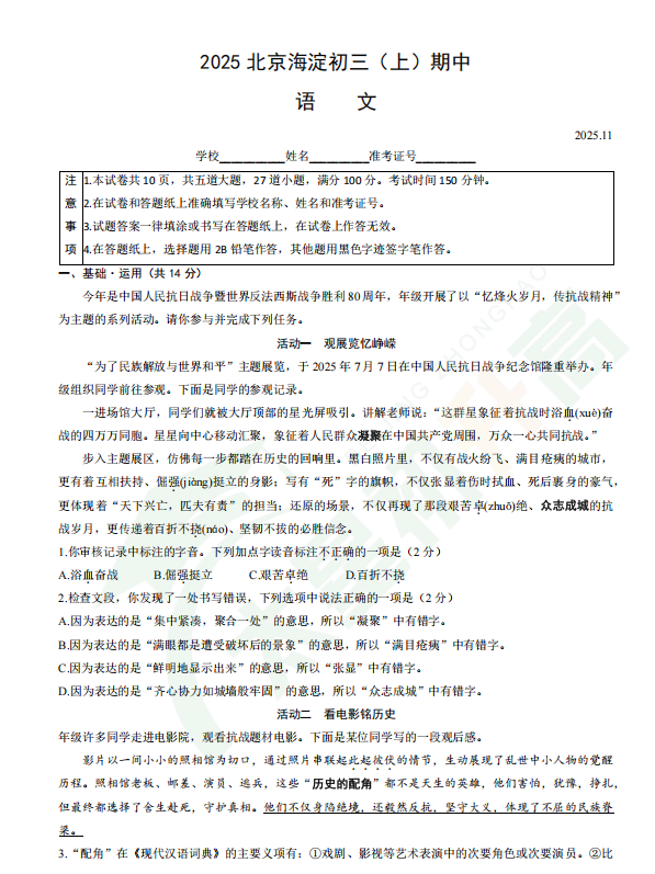作为2025-2026学年海淀区初三全区统考的核心科目,语文试卷已开放下载,文末附上下载入口。此次试卷严格贴合中考导向,既考查九上前三单元基础内容,又兼顾七、八年级知识,古诗文覆盖17首古诗与11篇古文,名著聚焦《艾青诗选》等四本。无论用于复盘错题、分析命题趋势,还是作为后续签约、直升的成绩参考,这份真题都极具价值,考生与家长可及时下载使用。