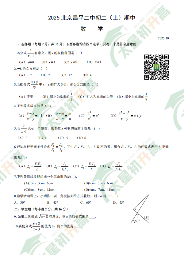 昌平区初二2025-2026学年度上学期期中数学试卷发布!含昌平二中真题卷完整内容,家长文末能下载查看。