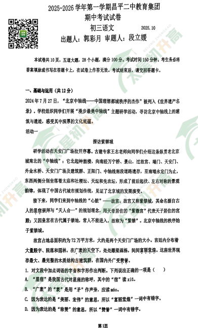 昌平区初三2025-2026学年度上学期期中语文试卷发布!含昌平二中真题卷完整内容,家长文末能下载查看。