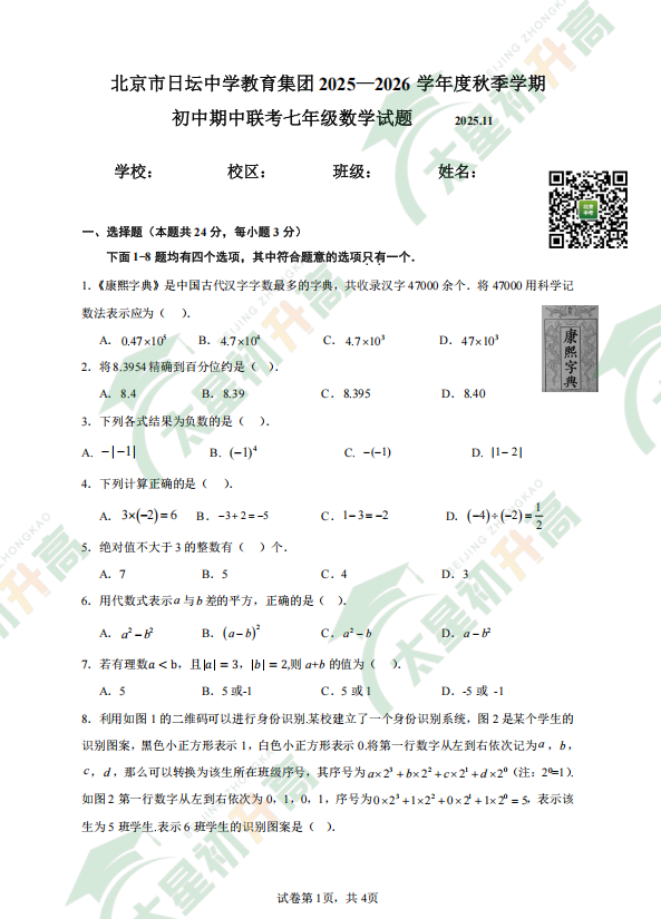 朝阳区初一2025-2026学年度上学期期中数学试卷发布!含北京日坛中学教育集团真题卷完整内容,家长文末能下载查看。